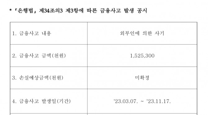 이미지 확대보기농협은행은 25일 외부인에 따른 금융사고가 발생했다고 공시했다. 사고 금액은 15억2530만원, 사고 발생 기간은 지난 3월 7일부터 11월 17일까지다.