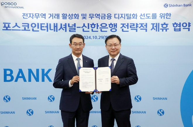 이미지 확대보기30일 금융권에 따르면 신한은행은 지난 29일 서울 중구 본점에서 포스코인터내셔널과 ‘전자무역 거래 활성화 및 무역금융 디지털화 선도를 위한 전략적 업무협약’을 맺었다.