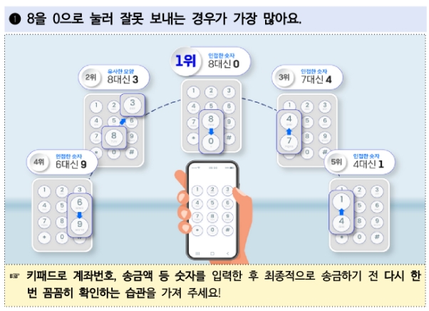 예보에 따르면 계좌번호 한 자리를 잘못 눌러 송금한 사례가 8659건에 달했다. 특히 휴대전화 키패드에서 원래 누르려던 숫자의 주변에 있는 숫자를 실수로 기입한 경우가 많았는데, 8 대신 0을 누른 사례가 다수였다. 또 8 대신 3, 7 대신 4, 6 대신 9 등 모양이 비슷한 숫자를 잘못 누르는 경우가 있었다.