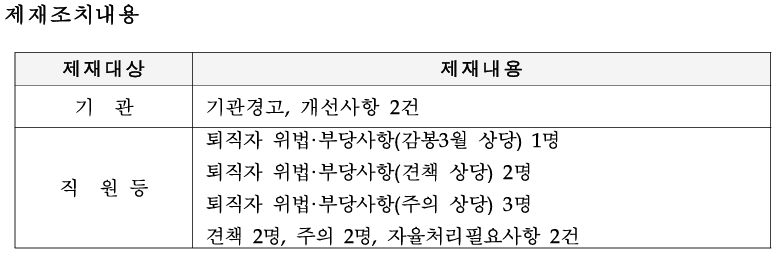 금융기관 제재는 등록·인가 취소, 영업정지, 시정명령, 기관경고, 기관주의 등 5단계이며 기관경고 이상부터 중징계로 분류된다. 금융사는 기관경고 이상의 제재를 받는 경우 최소 1년간 신사업 진출을 위한 금융당국의 인허가를 받을 수 없다.