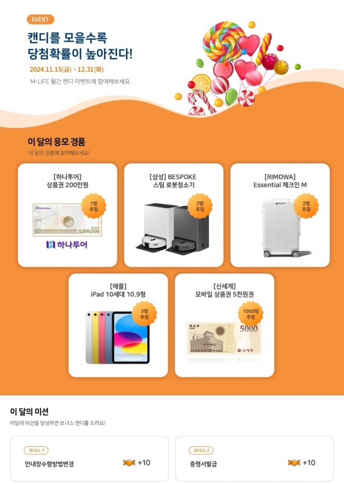 적립한 캔디는 경품 응모에 사용할 수 있으며, 응모하는 캔디 수가 많을수록 경품 당첨 확률이 올라간다. 이 달의 응모 경품은 하나투어 상품권 200만원(1명), 삼성 BESPOKE 스팀 로봇청소기(2명), 리모와 Essential 체크인 M(2명), 애플 아이패드 10세대 10.9형 64GB Wi-Fi(3명), 신세계 상품권 5천원권(1,000명) 등이다.
