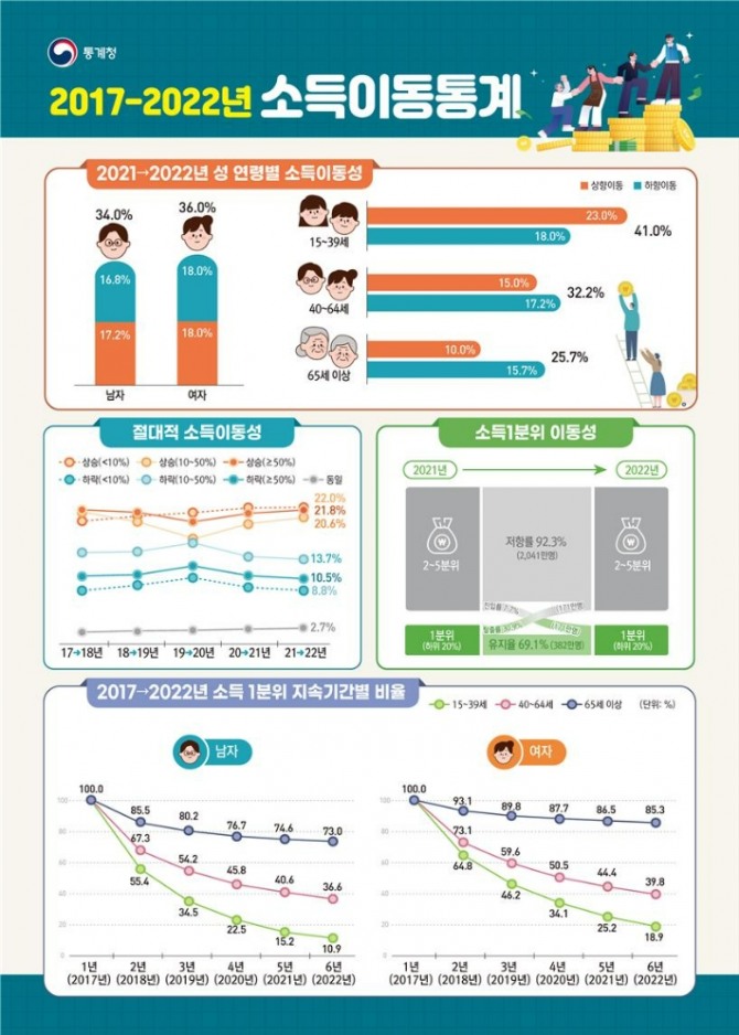 통계청이 18일 이 같은 내용을 담은 '2017~2022년 소득이동통계'를 처음으로 발표했다.