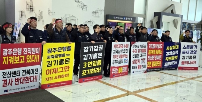박만 광주은행 노조위원장은 "지역 사회와 연대 투쟁을 통해 전산센터의 전북 이전을 반드시 막겠다"면서 "주요 의사 결정이 지역 은행과 무관하게 이뤄지고 있는 것이 큰 문제"라고 지적했다.