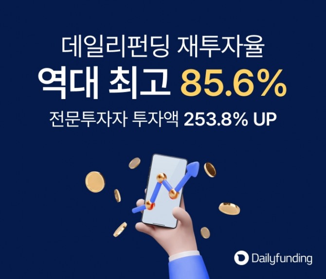 이미지 확대보기데일리펀딩 투자자의 재투자율은 창업 초기였던 2017년 48.7%였다가 1년 만인 2018년에 78.0%로 껑충 뛰어올랐다. 이후 5년 연속 80%대를 유지하며 상승세를 이어 가다 최근 역대 최고치인 85.6%를 기록했다.