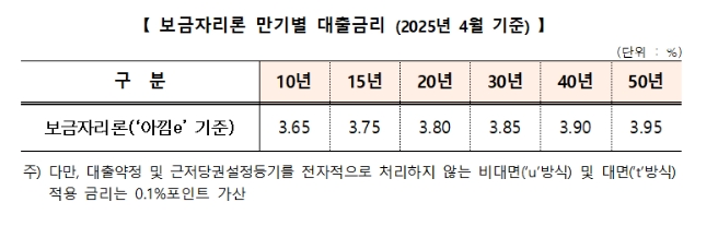 주금공은 ‘아낌e-보금자리론’ 기준 연 3.65(10년)~3.95(50년)%의 금리를 이같이 적용한다고 25일 밝혔다.
