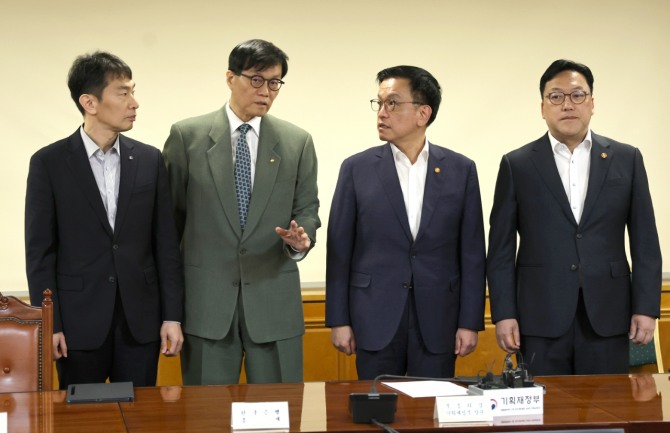 3일 서울 중구 은행회관에서 열린 '거시경제·금융현안간담회'에서 최상목 경제부총리 겸 기획재정부 장관이 참석자들과 대화하고 있다. 왼쪽부터 이복현 금융감독원장, 이창용 한국은행 총재, 최상목 부총리, 김병환 금융위원장. 사진=연합뉴스이미지 확대보기