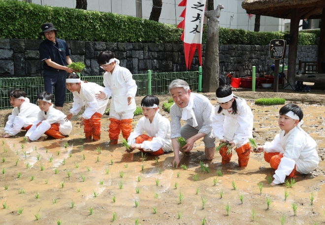 21일 서울 중구 농업박물관 앞 야외농장에서 열린 전통 손모내기 체험 행사에 강호동 농협중앙회장과 어린이들이 참여하고 있다. 사진=농협중앙회