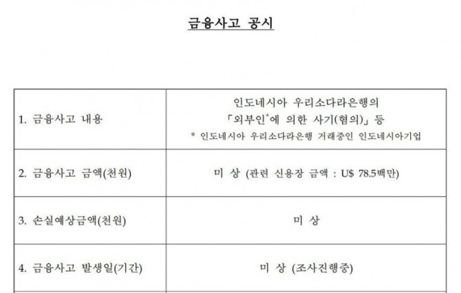 우리은행은 홈페이지 금융사고 공시를 통해 "우리소다라은행이 거래 중인 인도네시아 기업의 사기 혐의를 확인했다"고 2일 밝혔다.