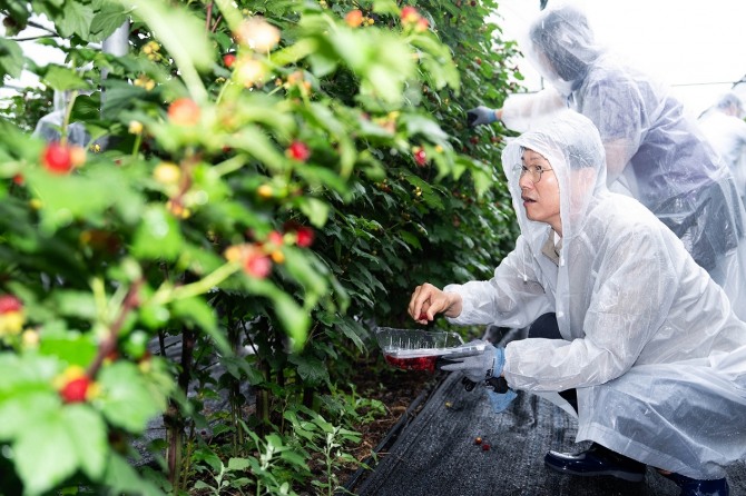 강 행장과 임직원 등은 경기 포천시 산딸기 농가를 찾아 부족한 농촌 일손을 도왔다.