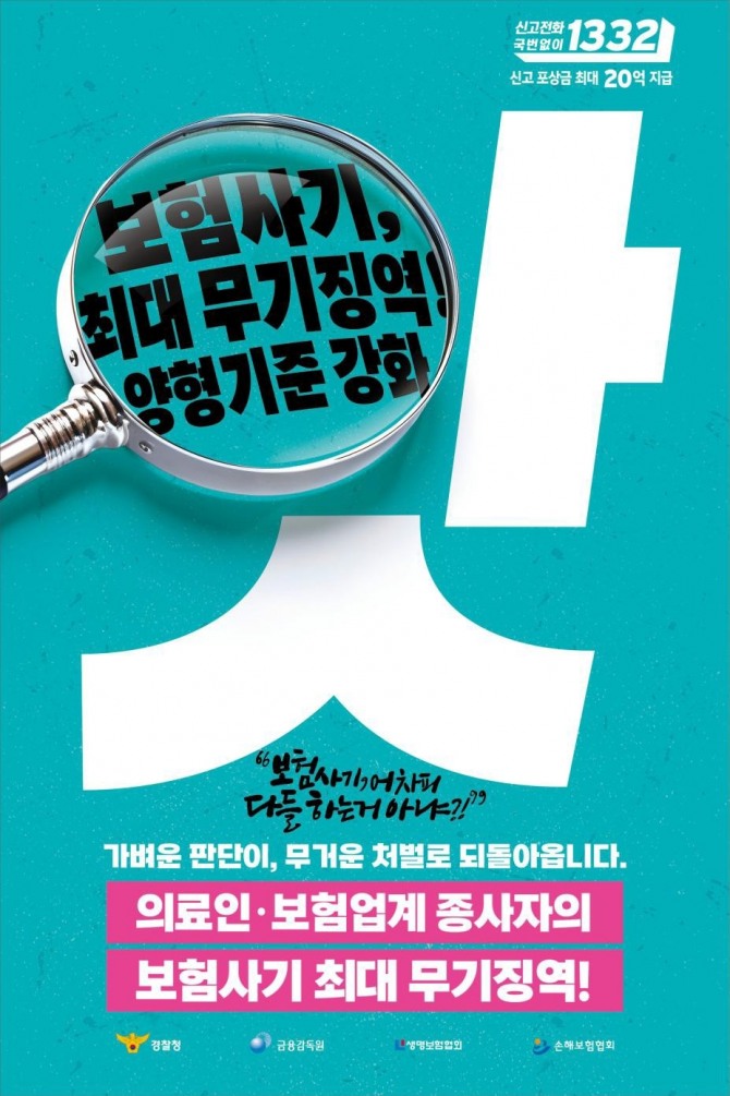 특히 보험사기의 심각성을 나타내고자 ‘헉’, ‘앗’과 같은 감탄사를 활용하여 강화된 보험사기 양형기준을 강조한다는 전략이다. 앞서 대법원 양형위원회는 의료·보험 전문직 종사자의 보험사기에 대해서는 가중 처벌이 가능(최대 무기징역)토록 양형기준을 개정한 바 있다. 개정안은 이달부터 적용한다.