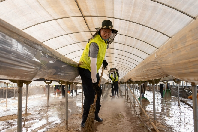 이미지 확대보기강태영 NH농협은행장이 29일 충남 당진시를 찾아 피해 농가 비닐하우스의 토사를 제거하고 있다. 사진=농협은행 강태영 NH농협은행장이 집중호우로 큰 피해를 본 충남 당진시를 찾아 수해복구를 위한 일손돕기에 나섰다.