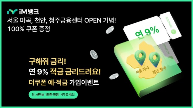 ‘더쿠폰적금’은 연 9% 금리(세전)를 제공하며 iM뱅크앱을 처음 이용하는 고객을 대상으로 1만좌 한정 판매된다.