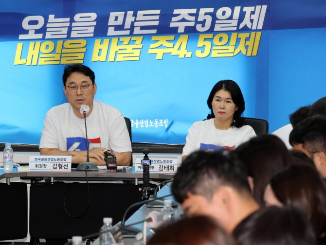 억대 연봉을 받는 금융권 노동자들이 이기주의적인 행태를 보이고 있다는 지적엔 "주 4.5일제를 고액 연봉자들의 배부른 소리로 보지 말아달라"면서 "금융 노동자의 60% 이상이 여성인 현실에서 주 4.5일제는 여성들의 돌봄 부담을 줄여 저출생 문제를 극복하는 데 기여할 것"이라고 강조했다.