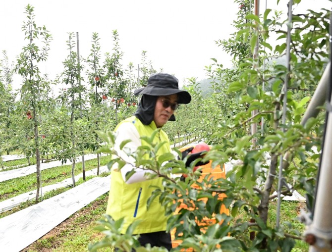 이미지 확대보기유지영 농협손보 경영기획부사장이 16일 강원 화천군 소재 사과 농가를 찾아 수확철 일손돕기를 하고 있다. 사진=농협손보 NH농협손해보험이 농번기 일손 부족으로 어려움을 겪는 농가를 찾았다.