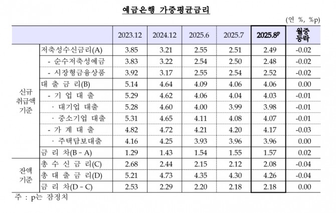 예금은행의 저축성 수신(예금) 금리(신규취급액 기준)는 7월 연 2.51%에서 8월 2.49%로 0.02%P 내렸다. 지난해 10월 이후 11개월 연속 하락이다.