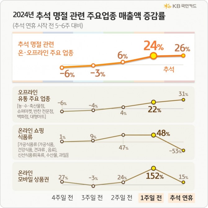 이미지 확대보기KB국민카드는 지난해 추석 연휴를 앞두고 명절 관련 업종의 소비 데이터를 분석한 결과, 온·오프라인 모두 연휴 시작 전 일주일간 소비가 가장 크게 증가했다고 30일 밝혔다.