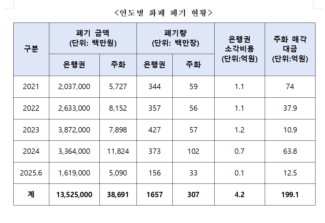 세부적으로는 지폐가 16억5700만장(액면가 13조5250억원), 주화는 3억700만장(386억원)이 폐기됐다.