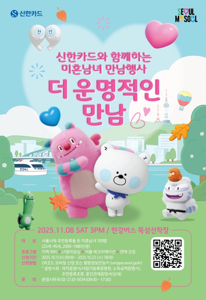 서울시와 신한카드는 남성 참가자들을 위한 메이크업 지원, 전문 MC의 연애 코칭 강의 등 맞춤형 프로그램을 준비해 참가자들이 보다 편안하게 소통할 수 있도록 지원할 계획이다. 최종 매칭된 커플에게는 데이트권 등 선물이 제공된다.