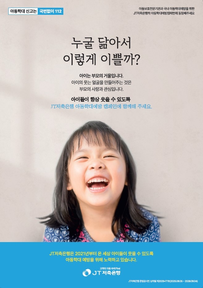 박중용 JT저축은행 대표이사는 “아동학대 예방은 사회가 함께 해결해야 할 과제”라며 “긍정 양육 문화 확산을 통해 아동이 건강하게 성장할 수 있도록 지속적인 지원을 이어가겠다”고 말했다.