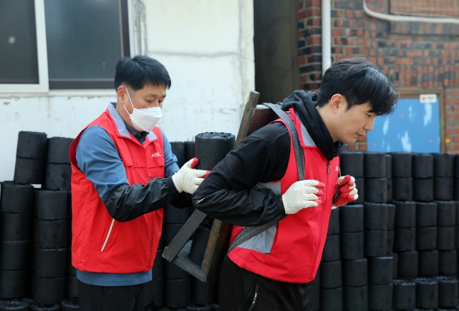 임직원 45명은 서울 노원구 상계3·4동 주민센터 일대에 연탄 2500장을 배달했다.