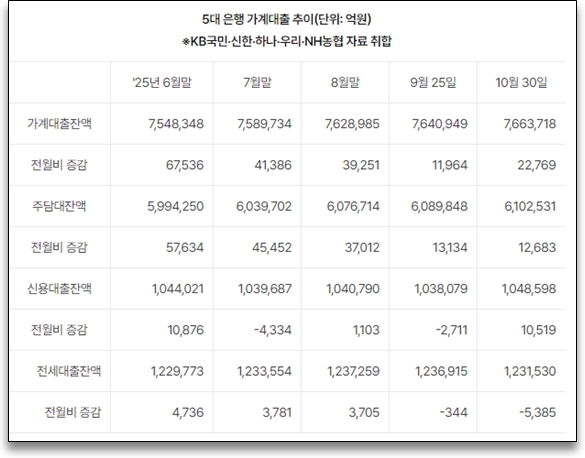 이미지 확대보기2일 금융권에 따르면 5대 은행(KB국민·신한·하나·우리·NH농협)의 전체 가계대출 잔액(766조3718억원)은 이달 들어 2조2769억원 늘어났다.