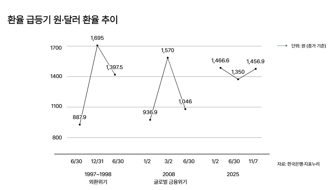 하반기 들어 종가 기준 원·달러 환율은 지난 9월 30일 이후로 하루도 빠짐없이 1400원 선을 유지했다. 지표누리에 따르면 달러 당 원화 가치는 외환위기가 있던 1997년 말 1695원까지 급등, 2008년 글로벌 금융위기 때도 1570원(3월 2일)까지 치솟았다. 이후 환율은 1000~1200원대에서 움직이다가 지난해 12월 1472.6원으로 크게 상승했다.