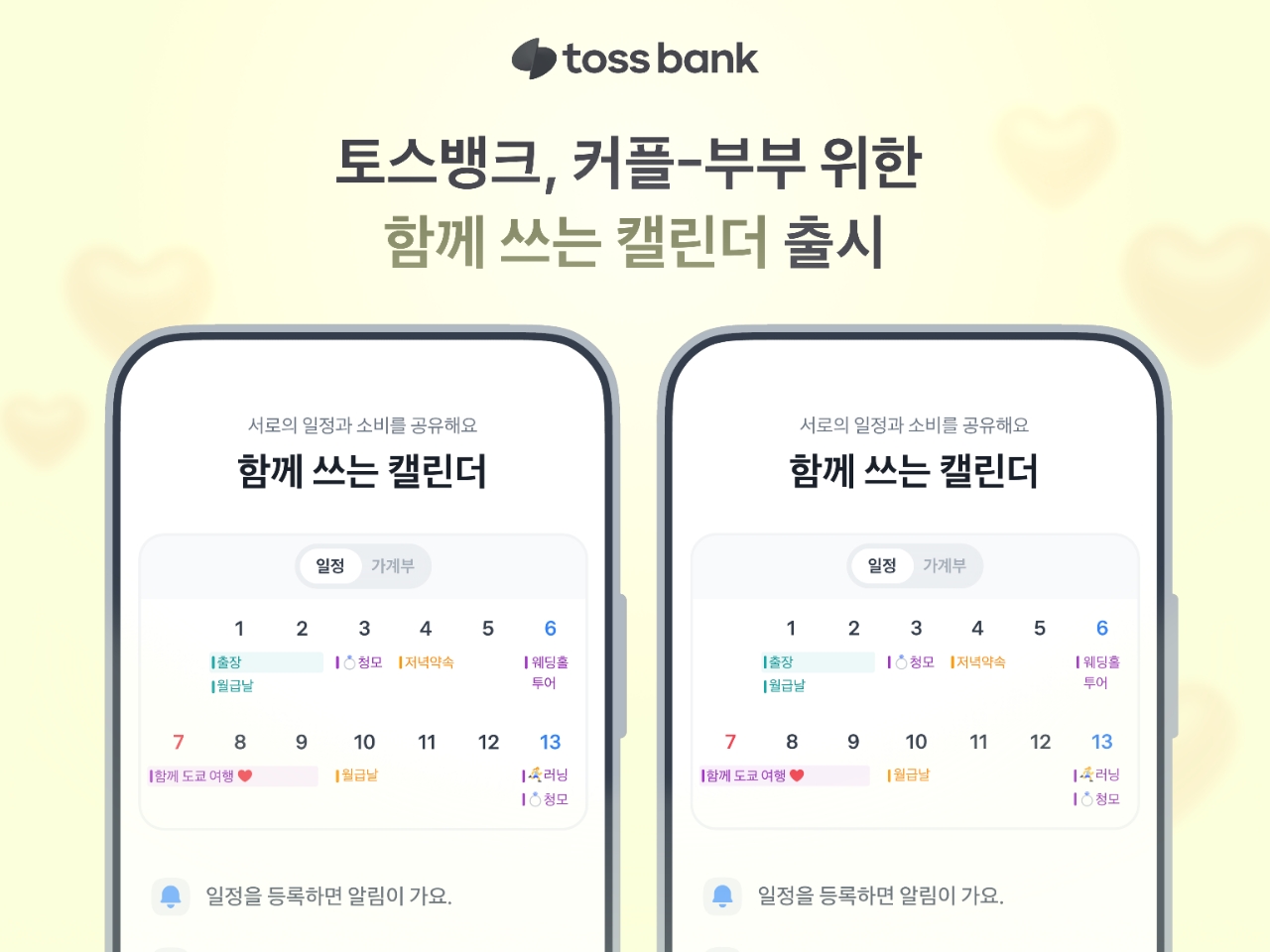 토스뱅크 관계자는 “함께 쓰는 캘린더는 단순한 일정 관리 기능을 넘어, 함께 사는 사람들의 하루와 소비가 자연스럽게 연결되는 생활 속 공유 플랫폼”이라며 “모임통장과 부부통장에 이어, ‘함께 쓰되 더 편리하게 관리하는 금융 경험’을 넓혀가겠다”고 했다.