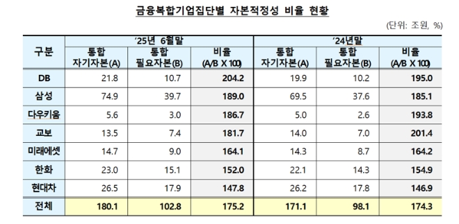 이미지 확대보기금융감독원이 20일 공개한 '금융복합기업집단 자본적정성 비율'에 따르면 2025년 6월 말 기준 교보·DB·다우키움·삼성·미래에셋·한화·현대차 등 7개 그룹의 자본적정성 비율은 175.2%로, 전년 말(174.3%)에 비해 0.9%포인트(P) 상승했다.