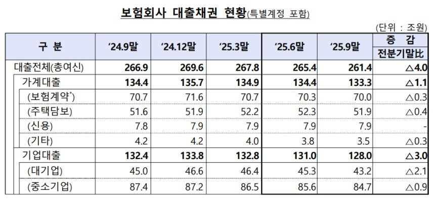 25일 금융감독원이 발표한 '9월말 보험사 대출채권 현황'에 따르면 지난 9월 말 보험사 대출채권 잔액은 261조4000억원으로 전분기 말 보다 4조원 줄었다.