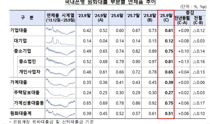 부문별로 보면 기업대출과 가계대출 연체율이 모두 전월보다 내림세를 보였다. 9월 말 기업대출 연체율은 0.61%로 지난달 대비 0.12%P 하락했다. 대기업(0.12%)과 중소기업(0.75%)대출 연체율은 각각 전월보다 0.03%P, 0.14%P 하락했다. 중소법인(0.81%)과 개인사업자대출(0.65%) 연체율도 같은 기간 0.16%P, 0.13%P 각각 낮아졌다.