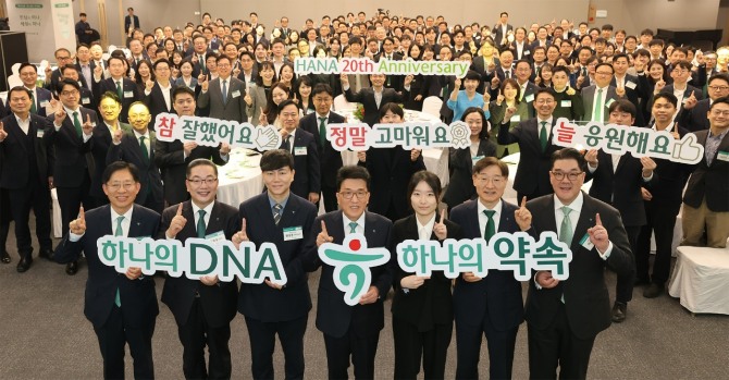 이날 함영주 하나금융그룹 회장은 출범 20년 기념식의 슬로건인 '하나의 DNA, 하나의 약속'을 통해 하나금융그룹이 대한민국 금융 환경의 변화의 시기마다 현실에 안주하지 않고, 생존을 위한 ‘진화’를 택하며 이뤄냈던 하나만의 도전과 성장의 역사, 그리고 이런 도전과 성장을 증명해 낸 ’하나의 DNA’를 임직원들과 공유하는 시간을 가졌다.