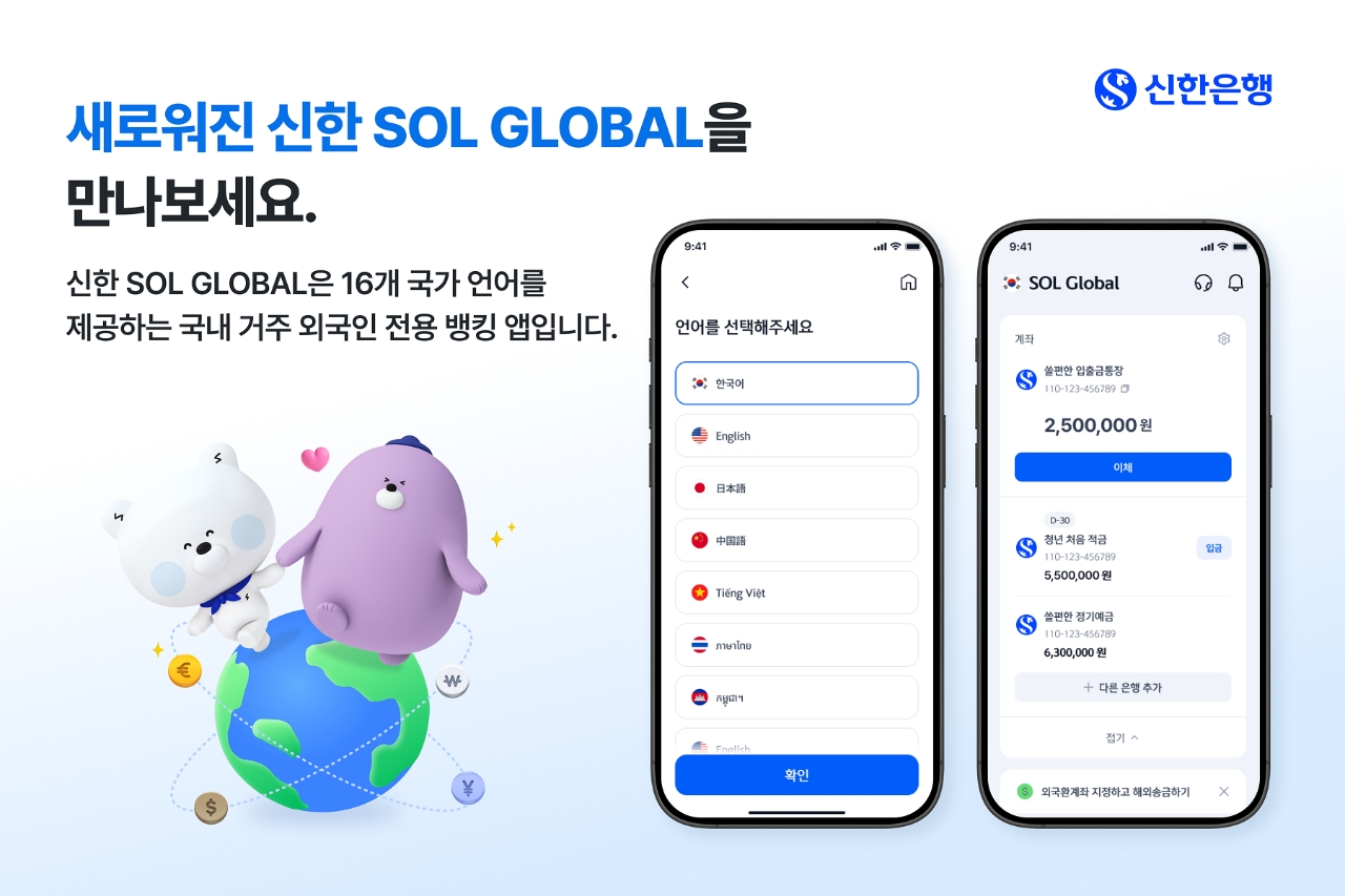 이미지 확대보기‘SOL Global’은 한국어를 포함한 16개국 언어를 지원하는 외국인 전용 모바일 뱅킹 플랫폼으로, 외국인 고객이 계좌 개설, 환전, 대출 등 주요 금융 서비스를 보다 편리하게 이용할 수 있는 앱이다.