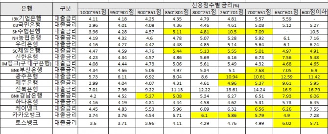 Sh수협은행과 제주은행은 저신용자와 고신용자의 대출금리가 3%포인트(P) 넘게 벌어졌다. 수협은행의 750~701점 구간의 대출 차주의 경우 10.5% 금리를 형성하는 반면, 한 단계 아래 구간인 700~651점 구간의 대출금리는 7.09%로 약 3.41%P의 차이가 났다. 제주은행도 600점 이하 구간의 대출금리가 상위 구간인 650~601점보다 3.66%P 낮았다.