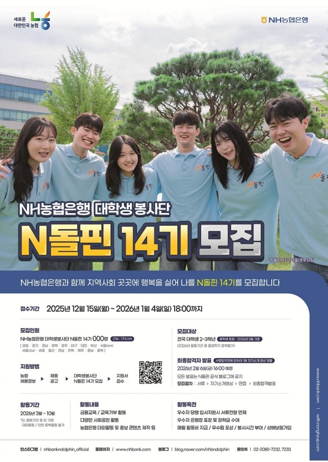 대학생봉사단 N돌핀은 2013년 창단해 총 1127명의 수료생을 배출했다. 이번 14기는 전국 총 126명의 단원을 선발할 예정으로 농협 채용정보 사이트에서 지원할 수 있다.