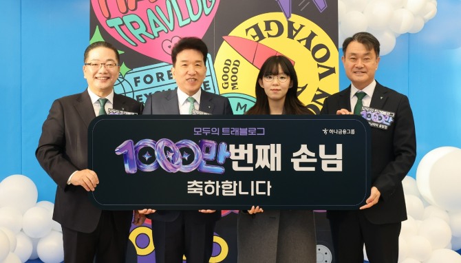 함영주 하나금융그룹 회장은 그룹 임직원들과 ‘트래블로그 1000만 돌파’ 축하 자리에서 1000만 번째 손님을 초청해 감사 마음의 선물로 ‘여행지원금’ 200만 하나머니를 증정했다.