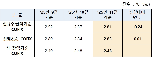 이미지 확대보기15일 은행연합회에 따르면 신규취급액기준 COFIX(자금조달비용지수)가 3달 연속 올랐다. 11월 기준 신규취급액기준 COFIX 값은 2.81%(+0.24%P)로 나타났다. 반면 잔액기준 COFIX (2.83%, -0.01%P)는 하락했지만, 신 잔액기준 COFIX는 2.48%로 전월과 동일 값을 기록했다.