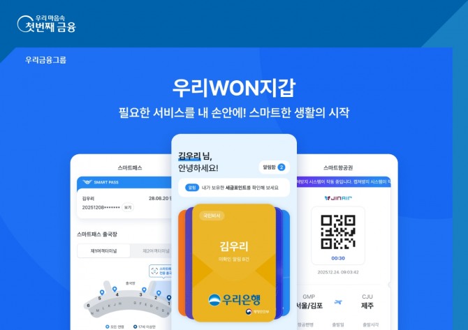 ‘우리WON지갑’은 일상에 필요한 생활편의 및 공공(정부) 정보를 모아 개인 고객별 디지털지갑 형태로 제공하는 서비스이다. 지난 6월 전면 리뉴얼을 통해 사용자 이용 패턴과 취향을 반영한 맞춤형 서비스 기능을 강화하였고, △주민등록증 모바일 확인 △디지털배지(경력증명)△스마트항공권 등 약 20여 종의 생활밀착형 서비스를 제공하고 있다.