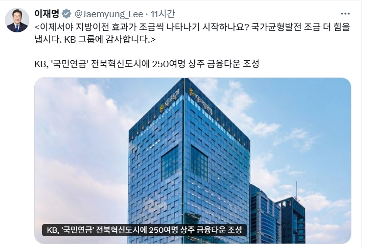 이미지 확대보기이 대통령은 29일 대통령 X 계정을 통해 "이제서야 지방이전 효과가 조금씩 나타나기 시작하나요? 국가균형발전 조금 더 힘을 냅시다. KB 그룹에 감사합니다."라고 밝혔다.