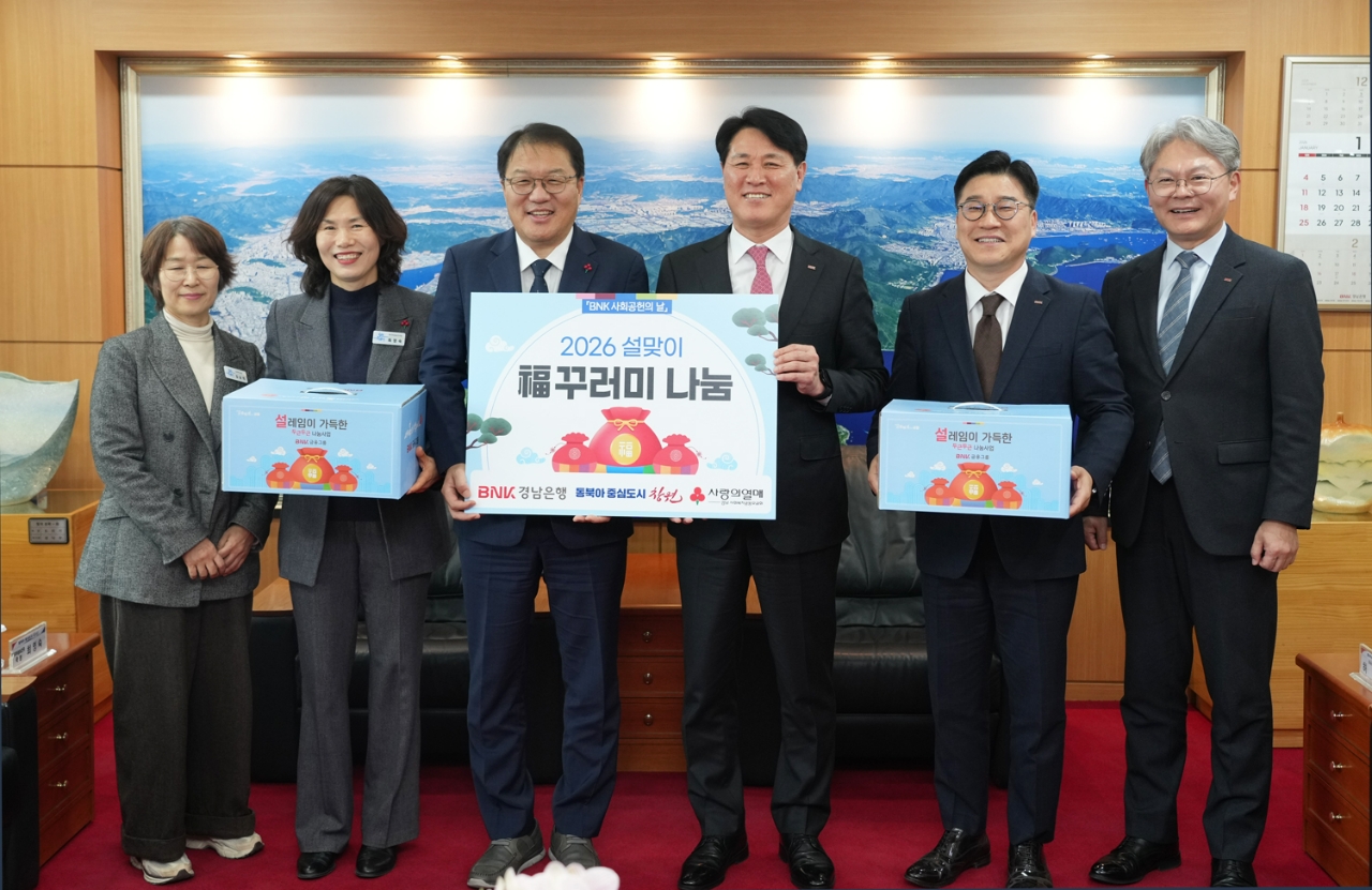 이미지 확대보기BNK경남은행은 29일 ‘2026년 설날맞이 사랑나눔사업’의 일환으로 창원특례시에 복꾸러미를 기탁했다.