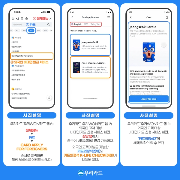 우리카드 관계자는 “외국인 고객도 내국인과 동일한 수준의 편리한 카드 서비스를 이용할 수 있도록 접근성을 높였다”며 “맞춤형 디지털 금융 서비스를 지속 확대하겠다”고 말했다.