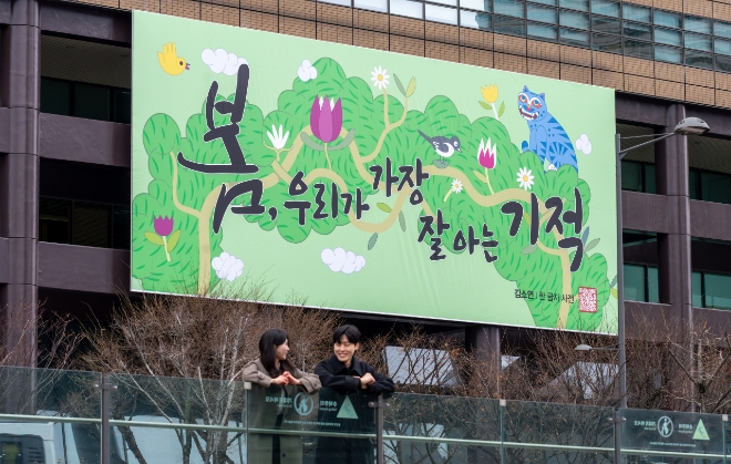 아울러 글판의 디자인은 전통 민화를 오늘의 감각으로 재해석해 눈길을 끈다. 생기가 넘치는 봄에 맞춘 초록색 배경과 힘차게 뻗은 나무 줄기, 꽃과 새 등 계절을 알리는 생명체를 담아냈다.