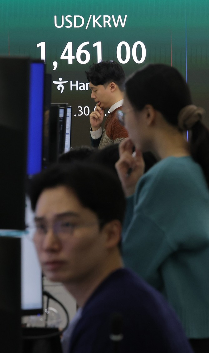환율은 이날 22.6원 오른 1462.3원으로 출발해 1460원선 안팎에서 움직이며 오전 11시 20분께 1467.8원까지 치솟기도 했다.