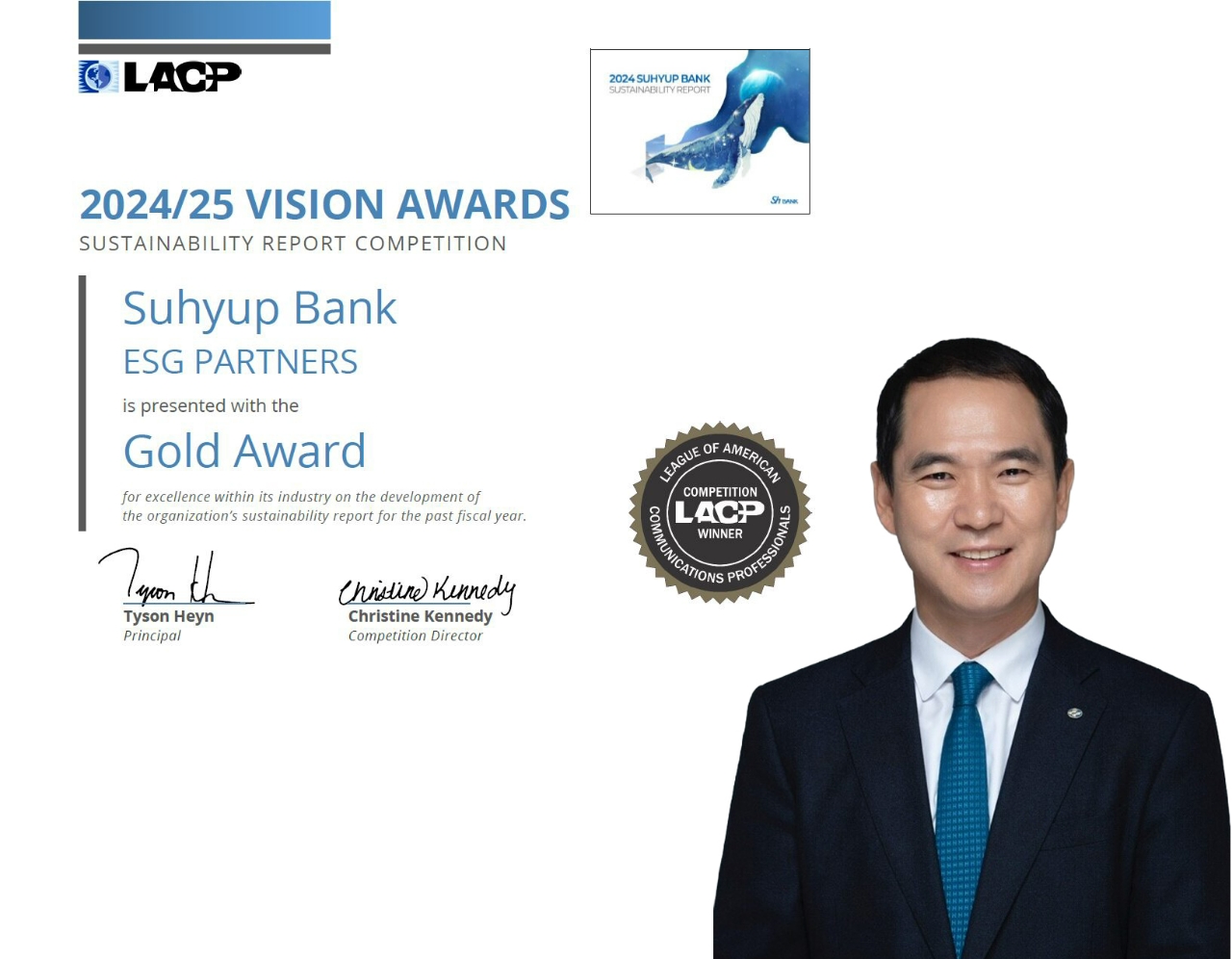 신학기 수협은행장은 “비전 어워드 첫 출전에서 거둔 글로벌 100위 진입은 수협은행의 지속가능경영 성과를 국제적으로 인정받은 값진 결과이다”면서 “앞으로도 이해관계자들과의 소통을 강화하고 투명하고 충실한 ESG공시를 통해 신뢰받는 은행이 되겠다”고 밝혔다