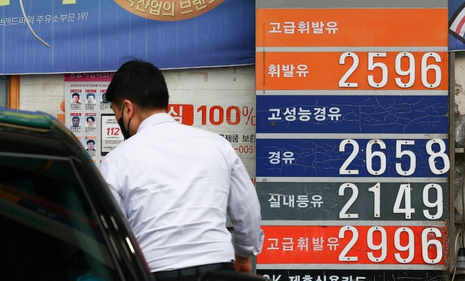 6일 오후 서울 시내의 한 주유소 가격표에 경유 가격과 휘발유 가격이 이틀 전보다 가격이 하락해 있다. 해당 주유소는 미국과 이스라엘의 이란 공습으로 촉발된 중동 정세 불안 여파로 국제유가가 급등해 경유 가격이 휘발유 가격을 웃도는 ‘가격 역전’ 현상이 나타났다. 사진=뉴시스이미지 확대보기