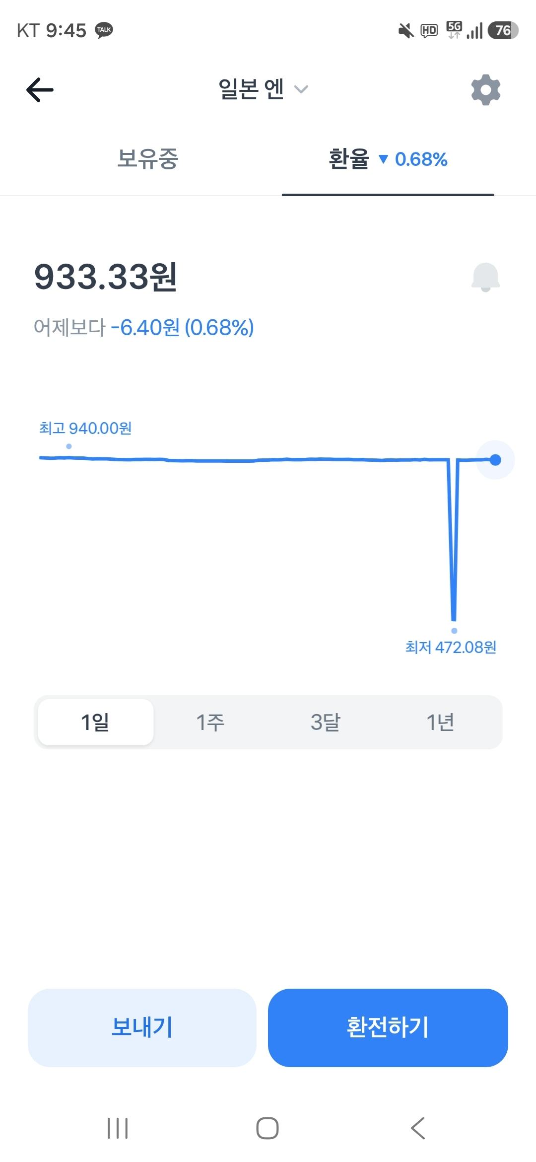 이미지 확대보기토스뱅크 앱에서 일본 엔화 환전에 오류가 발생하며 한때 반값에 거래됐다.