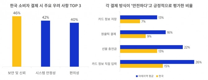 다만 결제 보안에 대한 신뢰도는 상대적으로 낮은 것으로 나타났다. 한국 소비자가 결제 과정에서 가장 크게 우려하는 요인은 ‘보안 및 신뢰’(46%)와 ‘시스템 안정성’(42%)이었으며 각 결제 방식이 안전하다고 평가한 비율도 아태지역 평균보다 낮았다.