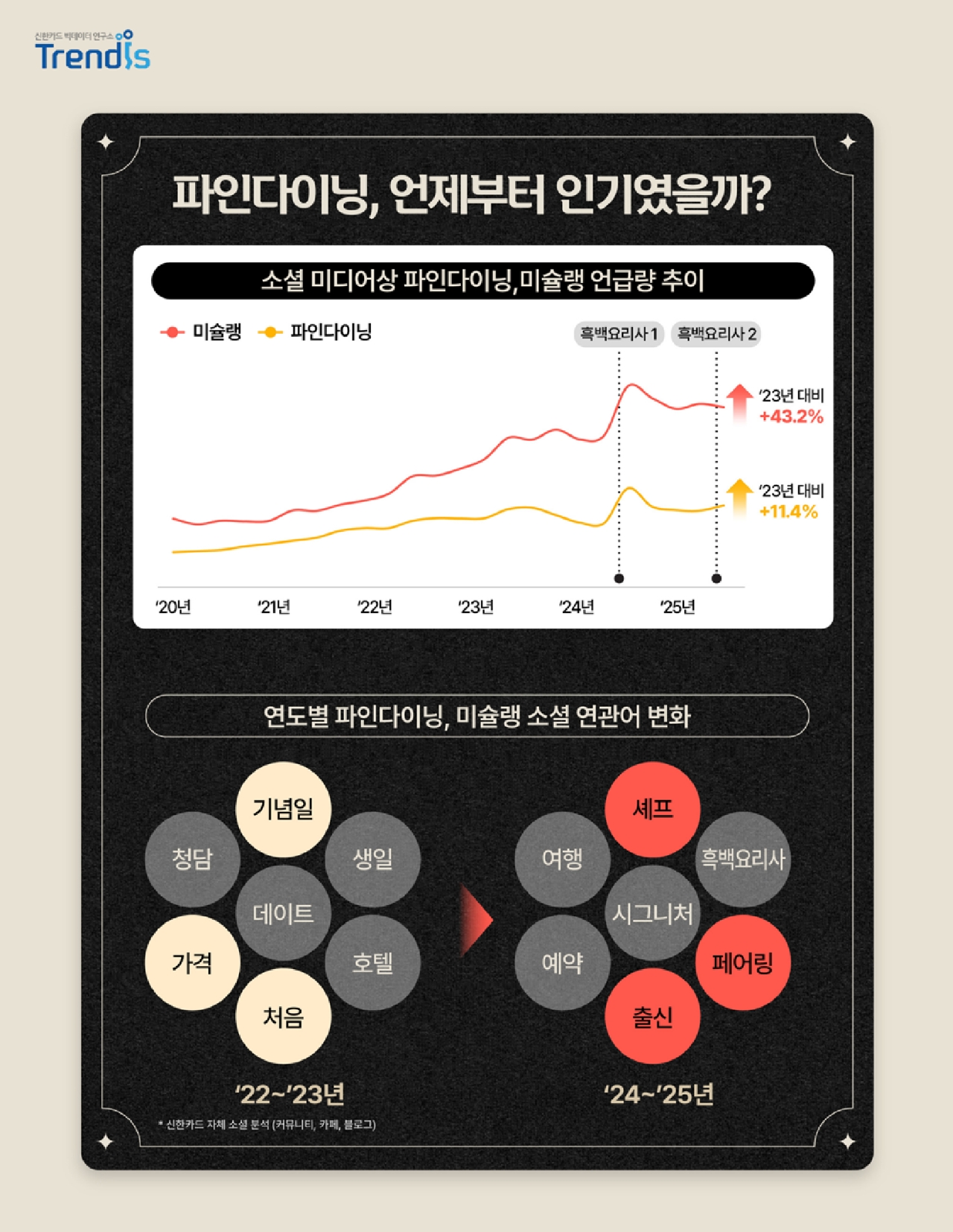 이미지 확대보기신한카드 빅데이터연구소가 SNS 데이터를 분석한 결과, 2025년 미슐랭과 파인 다이닝 관련 언급량은 2023년 대비 각각 43.2%, 11.4% 증가했다. 과거 ‘기념일’ 중심이었던 연관 키워드도 최근에는 ‘셰프’, ‘시그니처’, ‘페어링’ 등 음식의 본질과 경험에 집중하는 방향으로 이동했다. 이는 소비자들이 고가 레스토랑을 단순 식당이 아닌 하나의 콘텐츠로 인식하기 시작했음을 보여준다.