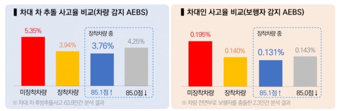 연구소가 차량 감지 ‘AEBS(비상자동제동장치)’의 차대 차 후방추돌사고를 분석한 결과 장착 차량의 사고율은 미장착 차량보다 약 26.5% 낮았다. 평가를 받은 차량 중 점수가 85.1점 이상인 차량은 85점 이하인 차량보다 사고율이 약 11.5% 낮았다.