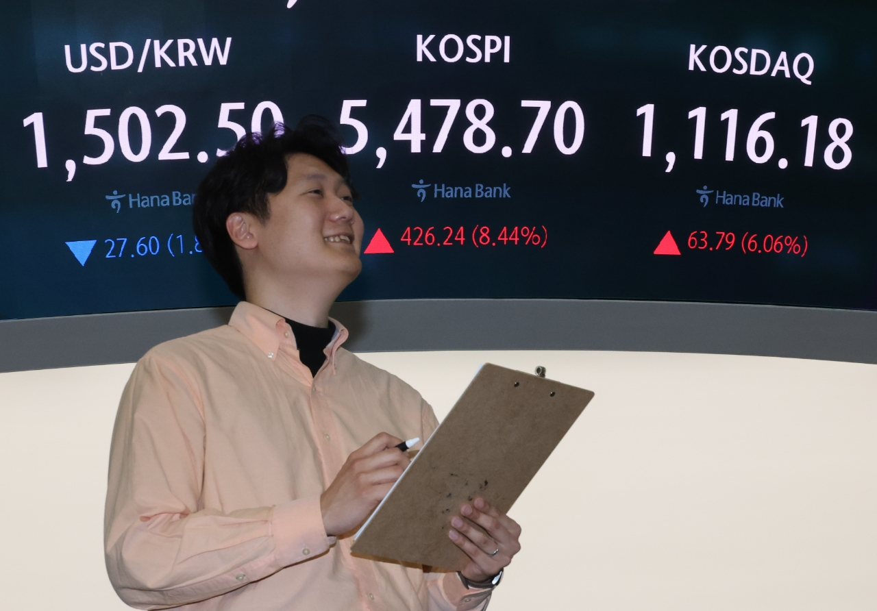 코스피가 급등한 1일 서울 중구 하나은행 딜링룸 현황판에 코스피·코스닥 종가가 표시돼 있다.이날 코스피는 전장보다 8.44%(426.24포인트) 오른 5478.70에 장을 마치며 5거래일 만에 상승세로 돌아섰다.코스닥지수도 전장보다 6.06%(63.79포인트) 급등한 1116.18에 장을 마치며 3거래일 만에 반등했다. 사진=연합뉴스
