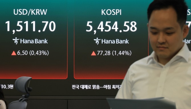 6일 서울 중구 하나은행 본점 딜링룸에 증시와 환율이 표시되고 있다. 이날 오전 9시 2분 현재 코스피는 전장보다 71.27포인트(1.33%) 오른 5,448.57이다. 지수는 전장 대비 46.05포인트(0.86%) 오른 5,423.35로 출발했다. 사진=연합뉴스